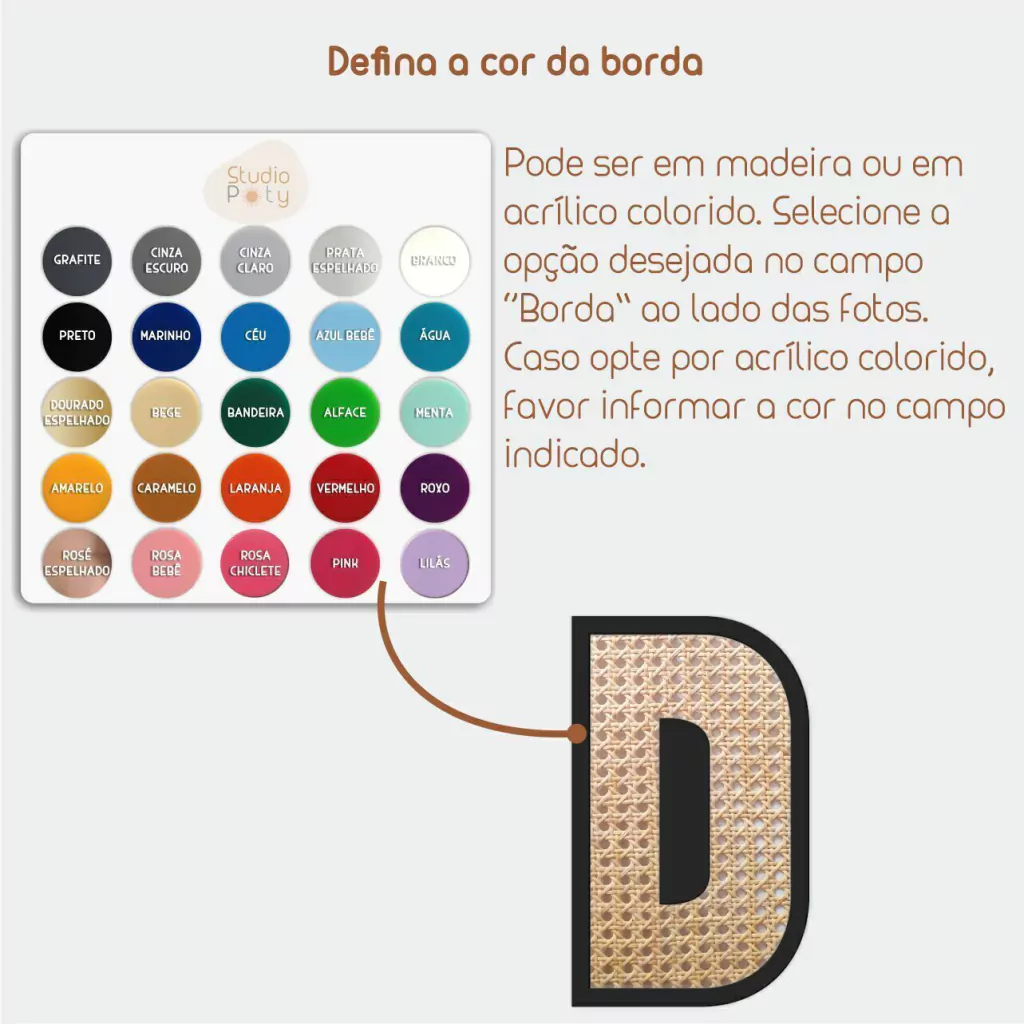 A borda pode ser em madeira ou em acrílico colorido, veja todas as opções de cor na última foto do álbum. Caso deseje colorida, opte pela opção "Borda -> colorida" e escreva a cor desejada no campo indicado.