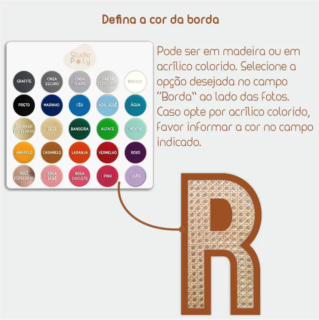 A borda pode ser em madeira ou em acrílico colorido, veja todas as opções de cor na última foto do álbum. Caso deseje colorida, opte pela opção "Borda -> colorida" e escreva a cor desejada no campo indicado